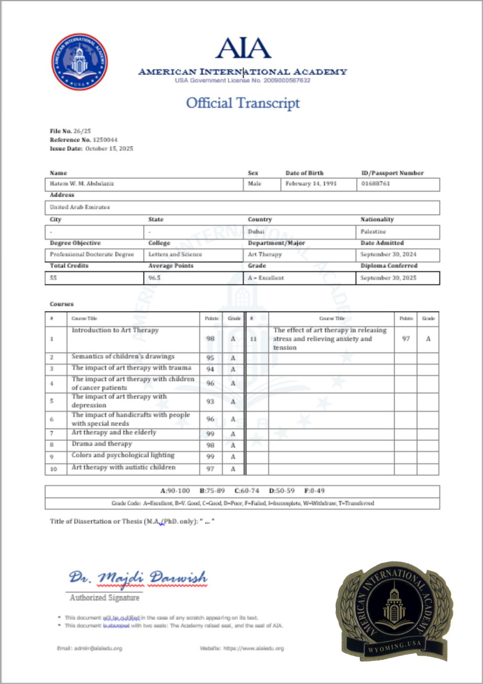 2- Accredited Transcript: It shows all of the credits accounted towards the degree, including the credits transferred from previous education and the credits earned at AIA.